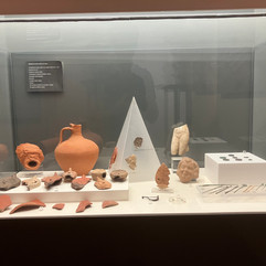 [Caption: Roman-era artifacts (1st century BCE to 1st century CE), hodgepodge mosaic flooring, and a marble sculpture of Pan's syrinx (musical pipe, a.k.a. panpipe), from the Venafro Archaeology Museum.]