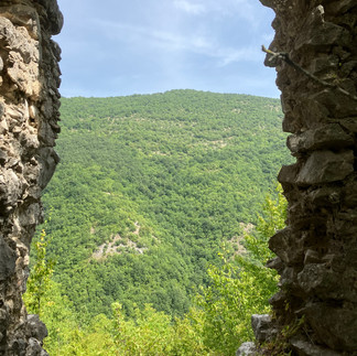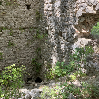 [Caption: Medieval tower and dry stone walls in the mountains outside of the town of Collemacchia.]