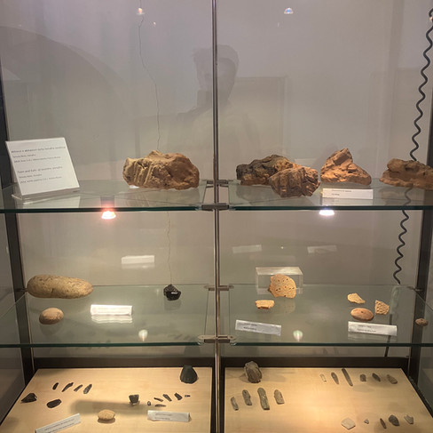 [Caption: Paleolithic artifacts at the Venafro Archaeology Museum. Various stone implements (left). The "oldest known Venafran," an infant's skeleton (right).]
