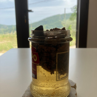 [Caption: Crushing oak galls collected from the mountain trails around Collemacchia to make ink.]